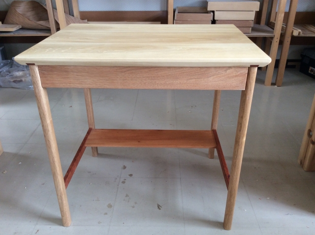 JUGEMテーマ:木工 引き出しの調整に手間取っていた脇机がついに完成しました。 この机は、野菜作りの記録などの日々の生活の中でパソコンに入力したいことを簡単に、何気なく、面倒くさく無くこなせるようにしたいという思いから作り始めたものです。そのために何気なく座っているような机がいいと考え、机にも気配が薄く、主張も無いものを作ることにしました。できた机は華奢で、材も余ったものを使い部材の色は多様です。引出しも取っ手の無い構造にして幕板のように見えるようにしました。全てウオルナットやケヤキで出...