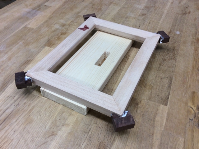 JUGEMテーマ:木工 木遊びの日が続いています。猫版画用の額縁作製も2日目で、彫った凹部に蝶の形に切り取った木片を万力を使って押し込み、その後表面をカンナを使って平面にしていきます。象嵌はそこそこ上手く行きました。万力で押し込む時に保護のために使った木片にはクッキリと蝶の跡が残り、このことは何かの時に利用できるような気がします。 次にブナの角材の両端を45度に切り落とします。この角度がきちんと出ないと四角に組めません。全行程でこの部分が一番難しい作業です。ここも何とかクリアし、額縁の上辺の...