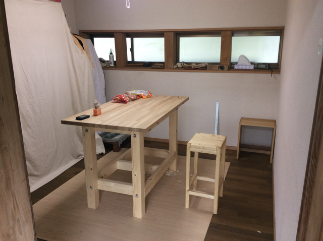JUGEMテーマ:木工 横浜の木工工房「木遊び」で作った作業台を片付けが終わった実家の物置の一室に搬入しました。スツールも、寺家木工舎に置いてあったものを持ってきました。作業台の天板は初め長さ130cmで発注していたのですが、部屋の大きさを考えて10cm短くしてもらったのが良かったようで、ぴったいポンです。 物置の片付け、作業台作り、スツール作りのここ数ヶ月をかけた個々の作業が結実したことが嬉しく、自分へのお祝いに大好きな柿の種とミックスナッツを買ってきました