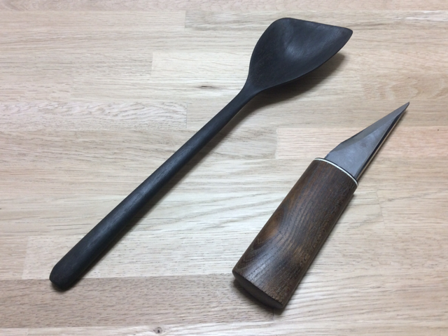 JUGEMテーマ:木工 実家の物置に設置した作業台で、scoop(スクープ)と呼んでいる木のしゃもじを作りました。木の種類は黒檀。30センチくらいの長さの直方体から削り出して作ります。 この形の木のしゃもじは26年前に作り始め、いろいろな種類の木で同じ形のものを作って来ました。多分黒檀は35種類目だと思います。 Scoopを作り始めた経緯も長い話となります。 米国の駐在生活が終わりに近づいてきた時、何か日本でも続けられる余暇の過ごし方を見つけようと思い、一緒に仕事をした研究所の人たちから余暇の過ご...
