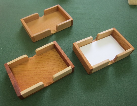 JUGEMテーマ:木工 木の端材を使って、名刺のケ−スを二種類製作してみました。 一点めは、机やカウンタ−の上に置いて使うタイプです。 ケヤキや、みずき、シナ、その他色々な板を使っています。 二点目は、携帯用のフォルダ−タイプです。 厚さ4〜5mm程度の収納部分に簡単なバネを仕込んであるので 下のように逆さまにしても中の名刺が落ちることはありません。