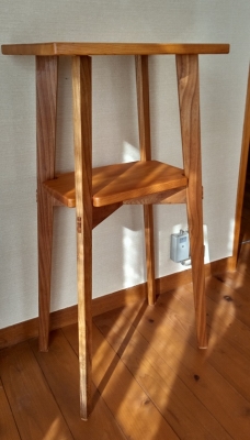 JUGEMテーマ:木工 注文製作で、仕事用の小机を作らせて頂きました。 材料は先に紹介した額縁製作に使用したケヤキを天板と中段に使っています。 脚部材もやはりケヤキで少し色味が濃い柾目板です。 4本の脚は下に少し開いて踏ん張るデザインにしましたが 中段の繋ぎ材を写真のように交差させています。 下の写真は裏側の製作途中の様子です。 久々の家具製作を楽しませて頂きました。