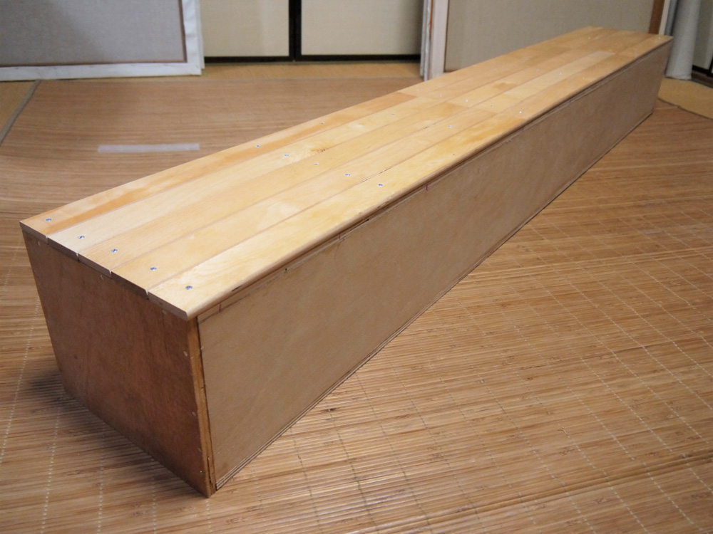 JUGEMテーマ:木工 またまた日曜工作。 僕は普段、和室の壁際に高さ25?ほどのマットレスをベットにして寝ております。 壁からスペースが欲しいと思ってたので、ベッドサイド用の長さ180?の台を作ってみました。 天板は前から実家に余ってた同じ大きなの大量の板をやっと上手く使えた。 ニスも塗られたキレイな板で捨てなくて良かったぁ〜 土台の箱は180x90?の合板をお店で縦に切ってもらい組んだだけ。 フタが開くようにして収納にしようかとも思いましたが、強度が下がるのでやめました。 上に乗って...