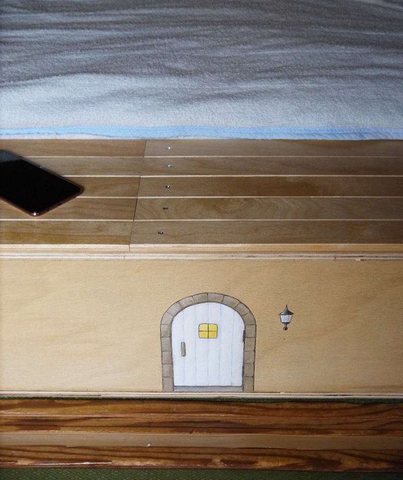 JUGEMテーマ:木工 作った台をさっそくセットして寝ました。 今朝、隣の部屋から見ると、うわぁ!いつの間にか扉ができてるっ!! と、メルヘンなこと言うてみたり・・・(*'▽') 昨夜、半沢直樹を観ながらラクガキしてたら、ムキになって色まで付けてしまいました。 アクリル絵具で木に描くことは普段しないので、新鮮で楽しかった。