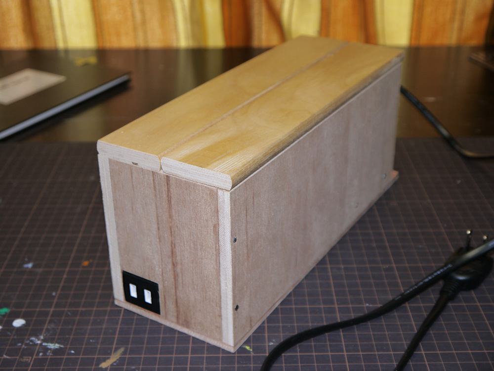 JUGEMテーマ:木工 今週も日曜工作です。 こんな箱を作ってみましたよ。何でしょう・・・ 天板はベッド横の台に使った木の余り。 その他もすべて合板の切れ端。ただ組んだだけ。 フタを開けると、コンセントタブが入ってます。 大きいアダプターを差しても隣の差し穴に影響しない間隔の広いのが気に入って購入。 最近、飛び起きるくらい大きい音の雷がありまして…万が一に備えて落雷ガード付きが欲しかったんです。 雷が落ちて、家のコンセントから実際に高電流が電化製品に行くの...