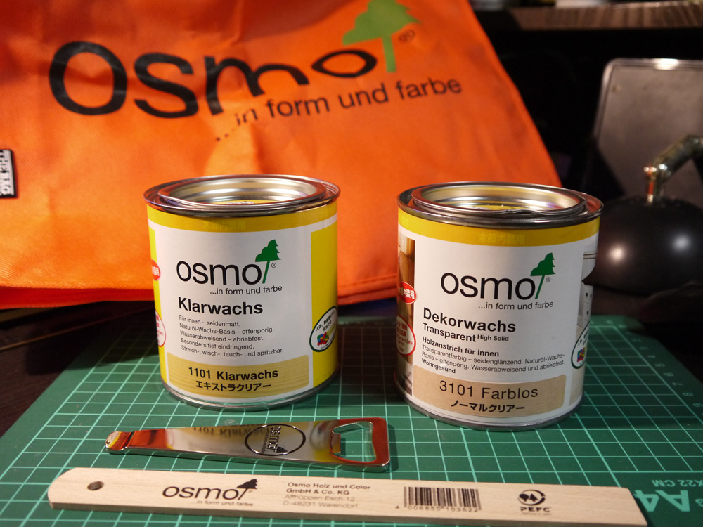 JUGEMテーマ:木工 ドイツ生まれの木工用、自然塗料、2種類をオスモの公式サイトから買ってみました。 缶を開ける器具と混ぜ棒、オレンジ色のトートバックも付いてきた。 栓抜きみたいな開ける器具、めちゃ嬉しい。 ただ、375ml缶2種で6800円もしましたよ。 最近はずっと有名どころのワトコオイルを使ってきましたが、値段もその倍以上のオスモカラーを実験的に使ってみることにしました。 どちらも木材の表面に膜をはるタイプではなく、木に染み込んで保護するタイプ。 右がワックス成分が多いもの。 ...
