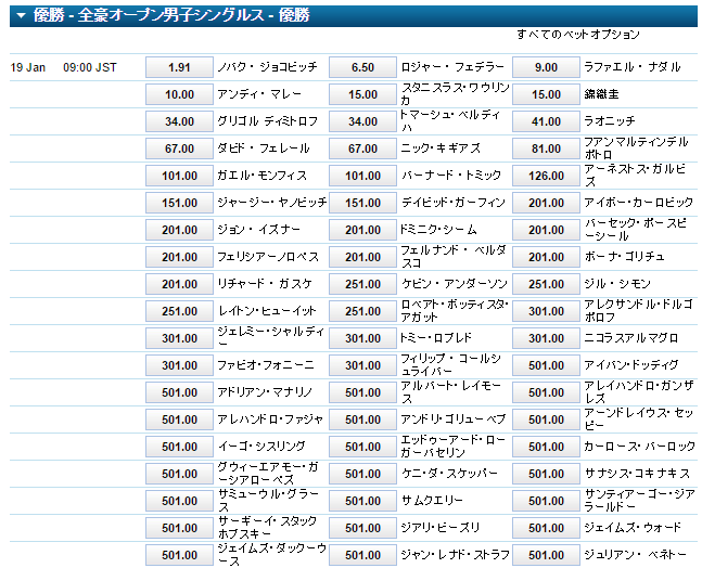 JUGEMテーマ:ギャンブル <strong>錦織圭</strong>が出場する <strong>全豪オープンが始まります!</strong> 今年の錦織圭は本当に楽しみです。 早くも始まる四大大会! ほんとに優勝しちゃうんじゃないの!? って思えますもんね・・・ 去年までは考えられないことです。 錦織圭に賭けて熱く熱く応援して 財布が厚くなる・・・なんて最高ですねヽ(´▽`)/ 優勝予想では、「5番手」評価の 15倍と <strong>おいしいオッズです!</strong> ...