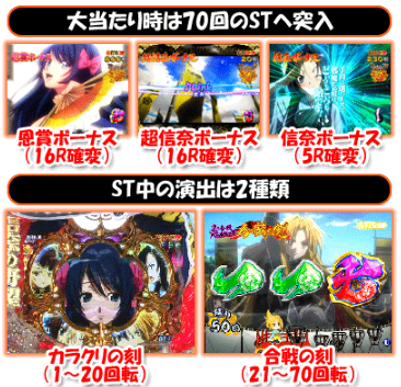 ゲームの流れ ■大当たりとなると70回のSTへと突入する。ST突入率は100%となっているが、電サポの付かない5R確変が存在する。ただし、潜伏中の大当たりは電サポ70回が付く仕組みになっている。 ST前半20回は「カラクリの刻」。後半50回は「合戦の刻」となり、バトルを楽しめるようになっている。 勝率アップの秘訣【ステージ止めで差をつけろ!】 ■ステージ・アタッカーともに性能良好なので、ステージ止めを駆使した立ち回りを実践しよう。 JUGEMテーマ:パチンコ JUGEM...