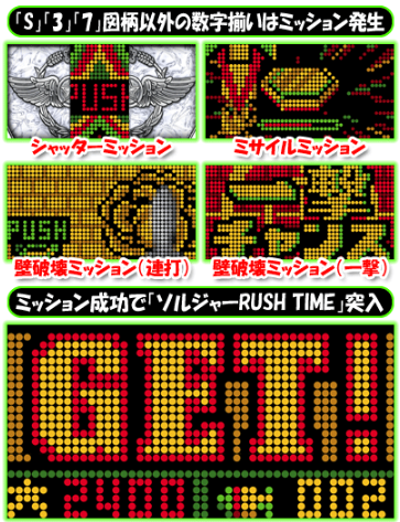 ゲームの流れ ■「S」「3」「7」図柄以外の数字揃いはチャレンジBONUSとなって、ミッション成功で「ソルジャーRUSH TIME」となる。「ソルジャーRUSH TIME」は次回大当たりまで継続する小当たりRUSHだ。 図柄テンパイが運命の分岐点となる。「S」「3」「7」図柄以外の数字はチャレンジBONUSだ。ミッション成功を祈ろう。 RUSH中は、デジタルにミサイル図柄がひとつ止まるとショート小当たりとなって、アタッカーがショート開放する。 ミサイル図柄がふたつ止まるとロング小当たりとなって、アタッカーがロング開...