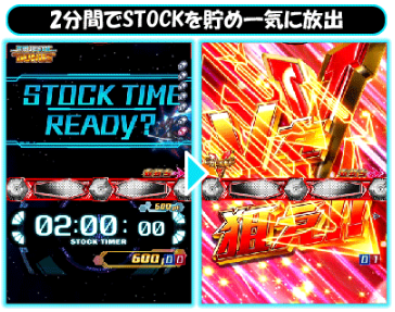 ゲームの流れ ■大当たりとなり、「STOCK TIME」突入となったら、右打ちで消化。2分間でいかにSTOCKを貯められるかがまとまった出玉を獲得するカギ。1個でもSTOCKできれば次回大当たり濃厚だ。 2分間の間にできるだけスルーに玉を通しデジタルを回すかがSTOCKを貯める秘訣となる。STOCKは最大で4個貯めることができ、貯めた分の大当たりが一気に放出されることになる。STOCKの数はデジタル脇のランプと「V」で表示される。 STOCK TIME中の演出 ■STOCK中はさまざまな演出に注目しよう。特にバトルリーチに発展すれば...