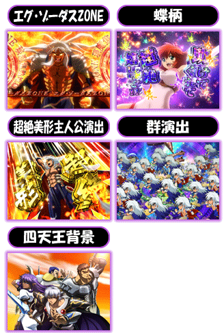 絶倫5大演出 ■大当たりに絡む率が非常に高い5つの演出を押さえておこう。まずは「エグ・ゾーダスZONE」は突入すれば大当たり後の保留で何かが起きるぞ。 「蝶柄」はいつでもどこでも出現すれば激アツ。この演出が絡んで大当たりすればCT突入!? 「超絶美形主人公演出」は出現時点で激アツ。ここで大当たりすればCTへつながるぞ。リーチ後に発生する「群演出」も同様だ。 「四天王背景」はリーチ後に発生すれば期待度が大きく上がる。 ゲームのポイント ■時短となるチャレンジタイム(CT)中に大当たりすれば継続率約94%...