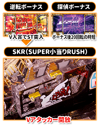 ゲームの流れ ■図柄3つ揃いからの大当たりで80回のST「逆転ボーナス」に突入する。V入賞させることでST突入となる。特殊図柄出現で8R通常の「探偵ボーナス」となる。20回の時短が付く。 ST中は約1/1でSKR(SUPER小当りRUSH)が発生。賞球12個のVアタッカーが開き、出玉を増やす仕組みだ。仮にSTをスルーしても、約1回分の大当たり出玉を獲得できるシステムだ。 ST中の演出 ■ST中は「エピソードST」と「チャージST」の2種類が存在する。 「エピソードST」はバトル勝利でセット継続を目指せ! 検事との法廷バトルで...