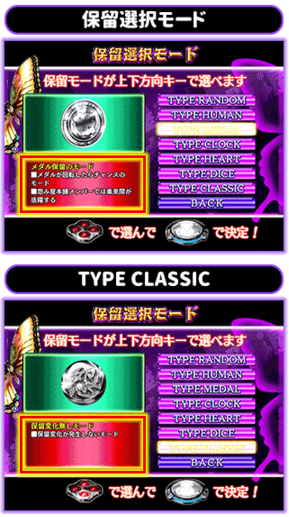 保留選択モード ■6つの保留モードが搭載されている。自分の好みでカスタマイズできる。選択したモード専用の演出が発生するが、基本的にはスタート入賞時から該当保留消化まで演出が続けばチャンスとなる。 「TYPE HUMAN(現代人の闇予告)」「TYPE MEDAL(スロット予告)」「TYPE CLOCK(懐中時計ルーレット予告)」「TYPE HEART(心電図予告)」「TYPE DICE(サイコロ予告)」など特有のアクションが発生。 また、先読み、保留変化がまったくない「TYPE CLASSIC」も選べるのだ。 罵詈雑言連続予告 ■悪人からの罵詈雑言...