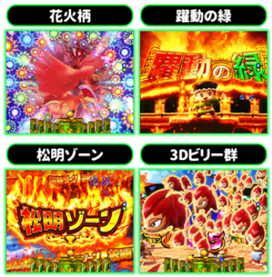四大演出 ■大当たりに結びつきやすい4つの激アツ演出を押さえておくべし。まずは「花火柄」はいつでもどこでも出現する可能性がある激アツ特殊図柄だ。もし1回転で2回出たら超激アツ!? 「躍動の緑」そして先読みの「松明ゾーン」、出たら期待度グンとアップの「3Dビリー群」……どれも大当たりには欠かせない存在だ。 ゲームのポイント ■「通常ゲーム」から松明ゾーンなどを経て大当たりすれば「スーパービッグボーナス(16R)」「チャレンジボーナス(9R)」「レギュラーボーナス(9R)」に分岐する。レギュ...