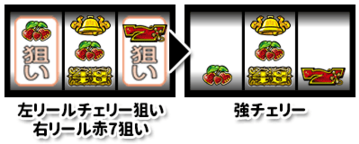 中押し小役狙い手順【下段48停止時】 ■強弱チェリー・赤7系のボーナス成立の可能性あり。左リールにはチェリーを狙おう。右リールには赤7を狙う。左リールにチェリーが停止した場合、右リールに赤7が下段に停止したら“強チェリー”。中段に赤7が停止した場合は“弱チェリー”だ。順押し手順での強チェリーと混同しないように気を付けたい。 中押し小役狙い手順【その他停止形】 ■残りリールは適当打ちでOK。中段ベル停止時は、弱チャンス目の可能性あり。チャンス目成立時はフラッシュが発生するので...