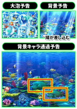 シンプルモード ■いつもの「海物語」と同じように遊べるシンプルモード。 「泡・魚群予告」は泡ならばスーパー発展のチャンス。魚群は言わずもがなの大チャンス。そして「大泡予告」はスーパーが確定するが、もしノーマルのままならば法則崩れで超アツアツ! 「背景予告」は海面から日が差したり、マリンスノー発光が合図だ。また「背景キャラ通過予告」も意外と重要。海中を泳ぐ魚の種類と数に注目。2匹ならばチャンスだ。 海底秘境モード演出 ■多彩な演出が展開されるこのモードのメイン演出は「ステップアップ予告」。...