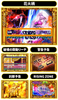 5大注目演出 ■大当たりに絡みやすい5つの注目演出を押さえておくべし。まずは「花火柄」。これは予告アクションやリーチ時などいろいろなところでエフェクト的に発生する。 「破壊の鼓動リーチ」は本機種最強のスーパーリーチ。リーチハズレ後に画面にノイズが走り発展する最強リーチだ。激アツ!! 「警告予告」はリーチ中に警告の文字が画面いっぱいに提示される。ここからは必ずSPリーチへ発展するのだ。 「刹那予告」は様々なタイミングで発生する。金色のゼウス出現は大当たりへの大チャンスなのだ。 「RISING ZONE」は先...