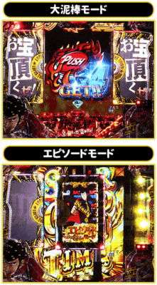 ゲームの流れ ■まずは図柄大当たりを目指そう。ST突入率は60%だ。ラウンド中にV入賞させることによってSTへと突入する。ラウンド中に突如タイプライタ演出発生もあり、最後まで見逃せない。慌てずVゾーンへ入賞させよう。 ST中は「大泥棒モード」と「エピソードモード」の2つの演出が楽しめる。 「大泥棒モード」ではさまざまな演出が発生したらボタンをゲット! ボタンをゲットするほどチャンスだ。獲得した数だけボタンをプッシュしよう。ボタンプッシュの度にカードが出現。いきなり大当たりをなるパターンもあるので、ど...