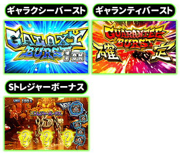 疑似&ART中の本物ボーナス ■疑似ボーナス中(準備中も有効)やART中に、本物BBが成立することを“BBonBB”と称している。この本物BB中は、ベルでも上乗せするため、基本的に毎ゲーム上乗せが発生することになる。 上乗せの期待度は、疑似ボーナス中の本物BB「ギャラクシーバースト」は、5段階評価で4.5。ART中の「ギャランティバースト」は、同3.5。 また、疑似ボーナス中やART中の本物RBは、ベルの押し順チャレンジに正解すると上乗せが発生。上乗せ期待度は、同3.0となっている。 ART中の疑似ボーナス ■ART...