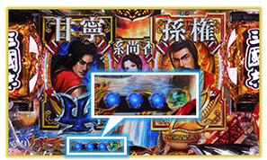 保留変化演出 ■液晶画面下部の保留表示が変化する。青→緑→赤→熱→蝶柄と変化すればチャンス。赤でチャンス、熱は文字通り。蝶柄は激アツとなる。 背景影変化演出 ■図柄変動にあわせて背景影変化が起きる。影で出現する武器の種類や文字によって期待度が変わる。 赤壁チャレンジ ■おなじみの赤壁を破壊することができれば、スーパーリーチ発展の大チャンス! レッドクリフを撃破せよ! 連続演出 ■続けば続くほどチャンスとなる。軍師verと武将verがメインだが、出現率の低い文字verが出れば...