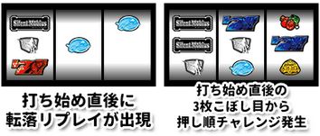 設定変更後の挙動 ■設定変更時は、純粋な通常状態から開始される(押し順チャレンジ失敗後の挙動を参照)。従って、早い段階で転落リプレイが揃うか、3枚の取りこぼし目が出現した後に押し順チャレンジが発生することになる。 設定変更後に数ゲーム回される対策がされていなければ、設定変更の痕跡は見つけやすいだろう。 ART:メビウスタイム ■ART「メビウスタイム」は、1セット50Gで、1Gあたりの純増は約1.3枚。ARTはゲーム数固定型となっており、1回の契機で最大10セットをストック。ART中もレア小役でストック上乗せを...