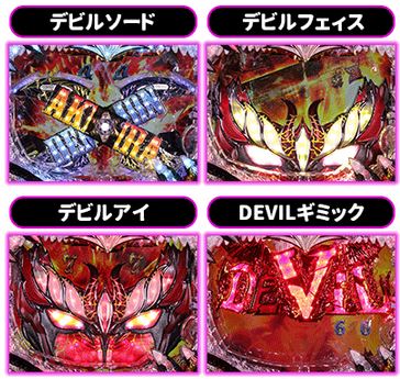 役物演出 ■当たりに必ずといっていいほど絡むのがこの役物演出。「デビルソード」はクロスで出現するとよりチャンスとなる。 「デビルフェィス」は盤面を覆う大迫力の役物。予告の最終局面で出現すれば信頼度が大きくアップする。 目の色が赤いと大チャンスとなる「デビルアイ」は予告アクションに合わせて、出現することが多い。連続予告と連動するとアツい!? 「DEVILギミック」は問答無用。降下した時点で大当たりが濃厚となる至福の役物だ。 ギガボタン ■盤面の前部に配置されたギガボタン。回る、光る、そして押し出...