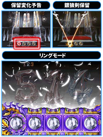 先読み演出 ■大当たりに絡む率も高い先読み系演出。おなじみ「保留変化予告」に注目。液晶内部の保留が青→緑→赤と変化するほどチャンス。特に赤はスーパーリーチに発展して大チャンスとなる。もしレインボーに変化したら超チャンスだ。 「銀狼剣保留」は保留表示に剣が刺さると発生する。通常は1本だがもし2本刺さることがあれば大チャンスとなる。また「シルヴァ保留」のエフェクトにも注意しよう。 「リングモード」は先読みゾーンとなる特殊演出で、該当保留でのチャンスアクションに期待しよう。 変動中予告 ...