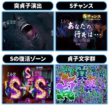 呪いの四大演出 ■大当たりに絡みやすい恐怖の4つのアクションを押さえておくべし。まずは「突貞子演出」なりそこない貞子出現で高期待度のスーパーリーチに発展する。3D演出が期待度をぐんとアップさせるのだ。 「Sチャンス」はスーパーリーチ選択の激アツアクション。ボタンの色やバイブ発生に注目。赤系エフェクトとバイブの結合はアツい! 「Sの復活ゾーン」はS図柄揃いで突入する大チャンスゾーン。必ず期待度の高いスーパーリーチに移行する。 最後は「貞子文字群」。これは従来の群演出ではなく、画面いっぱいにうじゃう...
