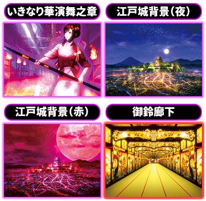 チャンスアップ背景 ■通常時から背景が変化すればチャンスとなる。「いきなり華演舞之章」→「江戸城背景(夜)」→「江戸城背景(赤)」→「御鈴廊下」の順で期待度がアップ。特に「御鈴廊下」は連続すれば期待度がグンと上がる。大当たりに絡む率も高いのだ。 役物演出 Part.1 ■豪華絢爛な役物が多数搭載されている本機種。大当たりにはこの役物が可動しないと到達しないと言っても過言ではない。 「大奥ロゴ役物」は衝撃のアクション。盤面を覆うこのロゴが落下すれば至福の時が約束される!? 「錠前役...