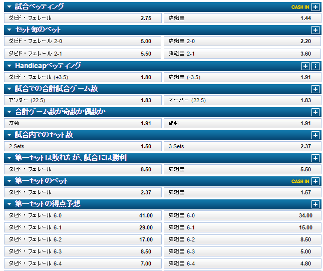 明日は、錦織圭が登場です! 日本時間で午前11時です。 前回に続いて今大会も期待できそうです! いや〜 それにしてもオッズが低いです・・・ セット2−0で錦織圭が勝っても 1.14倍にしかならないという 低いオッズです! まあ、それだけ「鉄板のゲーム」なんでしょうね・・・ 優勝候補でも1位です! こりゃほんとに グランドスラムに手がとどくかもねヽ(´▽`)/ 5分でプレイできるウィリアムヒルスポーツの登録方法 5分でプレイできるピナクルスポーツの登...