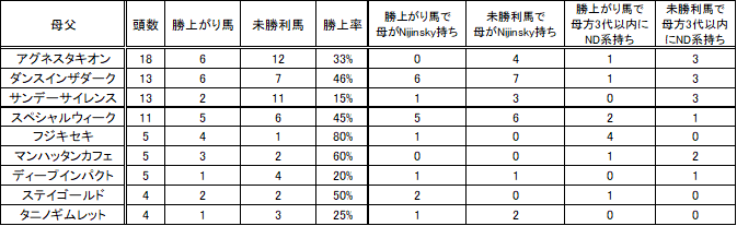 JUGEMテーマ:一口馬主 IHA自身が父方にMr. Prospectorの4×4を持つため、母父Mr. Prospector系は避けるべき。 実績としては4割程度勝ち上がってはいるのだが、地方交流や地方出戻りも多く、現状頭打ちになっている。 IHA自身がDanzigの4×4を持つため、母父ND系も避けるべき。 ただIHAでクロスになっているので、Mr. Prospector系よりも扱い易く、配合相手を考える際に親和性を高めるキーとなるのではないか。 やはり母父サンデー系をベースに、遠い血にND系を持つ形が親和性が高くなるのではない...