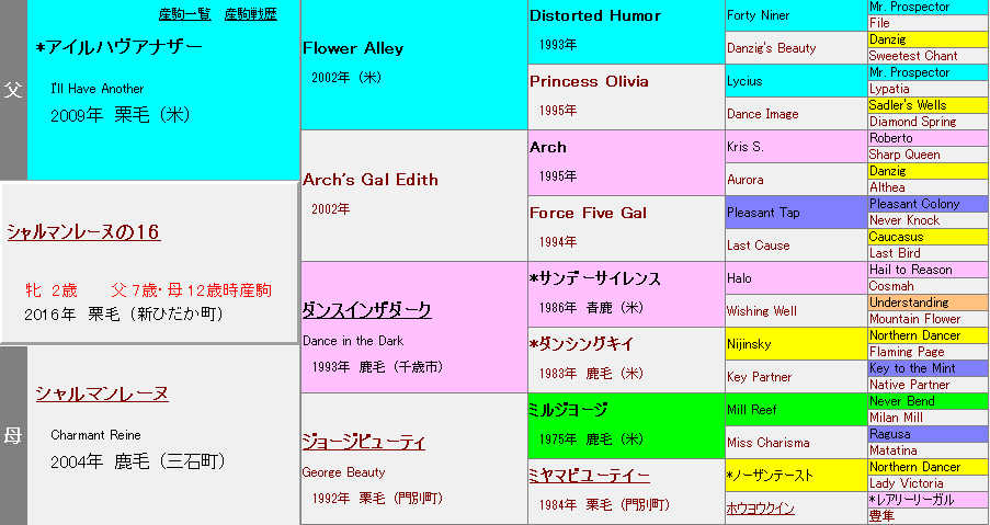 JUGEMテーマ:一口馬主 前回の続き。3次募集馬の中ではやはりシャルマンレーヌの16が候補。 母、シャルマンレーヌの現役時成績は芝1200で2勝、繁殖牝馬としては及第点。 本馬は4番仔で母12歳の時の産駒で、母年齢も不安なし。 ただ上1頭が安楽死と故障引退、ラフカディオも骨折と産駒の健康面には不安が残る。 この辺りは調教の進度等、近況をしっかり見てから判断しなければ。 ■配合 I理論的な考えは今回は置いておく。出資決めるまでには検討したいけど。 IHAには母父ダンスインザダーク...