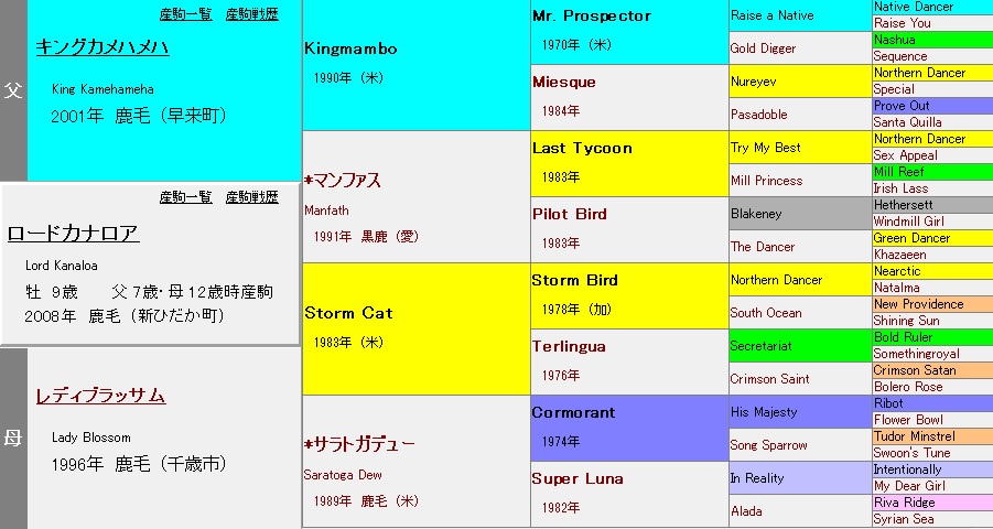 JUGEMテーマ:一口馬主 ロードカナロアの合いそうな配合を考える。 まずシンプルにノーザンダンサーのクロスを活かすためノーザンダンサー系との配合、 加えて父キングカメハメハ、母レディブラッサムに共通するNasrullah × Princequilloを持つ繁殖が合うんじゃないだろうか。(Mill ReefとSecretariat) もちろん、Graustark≒His Majestyを強調するのも良いと思う。 自分の好みとして5代内のインブリードよりも5,6代前の先祖を強調する配合が好み。 まだほとんどデビュー...