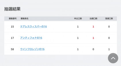 JUGEMテーマ:一口馬主 こんにちは! 昨日、先週レースに出たダンスウィズユーとグラドゥアーレの愛馬情報を見ようと思って、シルクHCのマイページにアクセスしてみたら、2017年第1次募集の抽選結果が反映されていました! 抽選対象は「アンティフォナの16」と「ウインフロレゾンの16」の牡馬2頭、前者が541口、後者が1,349口の申込でした。その内、狭き門だった「ウインフロレゾンの16」は残念ながら落選でしたが、日曜日に未勝利を脱出したグラドゥアーレの下の「アンテ...