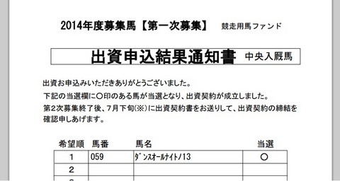 社台サラブレッドクラブ 2014年度1歳馬募集 申込の結果、見事当選となりました 最終投票数を見ると、第1希望では40票以下。第1希望で申込された方は、当選となったようです。 この度縁あって出資できることとなった仔は、 ダンスオールナイトの2013 牡1 【ハービンジャー×エルコンドルパサー×サンデーサイレンス】 生産:社台ファーム 栗東:中竹和也厩舎予定 4/30生まれ 栗毛 JUGEMテーマ:一口馬主