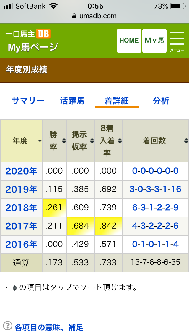 JUGEMテーマ:一口馬主 新年明けましておめでとうございます! 2020年の競馬が始まる前に、まずは2019年の愛馬の成績を振り返りつつ総括したいと思います。 出走頭数は4世代で10頭、26戦3勝【3.0.3.3.1.16】、勝率と連帯率が12%、複勝率23%、掲示板率38%でした。勝率、連帯率、複勝率、掲示板率の全てにおいて過去2年間よりも悪い数字となってしまいました。2019年は走れば半分以上の確率で掲示板外ということですから… ちょっと悔しいですね… ...
