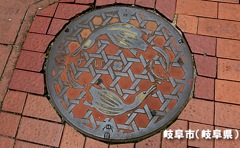岐阜市のマンホールです。 長良川名物 鵜飼いの鵜、鮎、鵜籠がモチーフです。 This is a manhole of Gifu-shi. A cormorant, a sweetfish, a basket of the cormorant fishing of the specialty of Nagara River are drawn on the manhole.