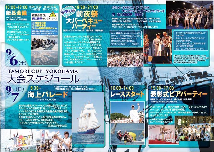 いよいよ 「タモリカップヨットレース横浜大会」が 目前に迫って来ました。 何と 167艇ものヨットが出場する ビッグレースです。 『海羚』のリコールナンバーは68番 http://media.wix.com/ugd/eb6d20_4a00c079574840688df904c7a2a562bd.pdf 土曜日は 15時から艇長会議&安全セミナー 18時半から盛大な前夜祭 日曜日は 8時半から海上パレード 10時からヨットレースが始まり レース後 15時半から表彰式&ビアパーティと 盛りだくさんなスケジュールです。 http://www.tamoricup-yokohama...