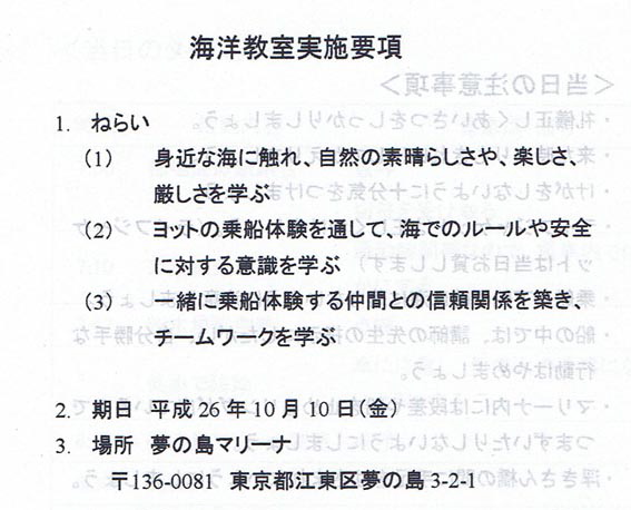 千葉市の高洲第一中学区青少年相談員の方々が主催して 秋休みの10月10日に 夢の島マリーナ〜ディズニーランド沖を舞台に ヨット『海羚』を使用して 「海洋教室」が開催されます。 先日も 主催者の方々を中心に 実際にヨットに乗ってもらいながら 安全管理について学んでいただきましたが 昨夜も スタッフの皆様を対象に ヨットに "内在する危険" と 事故防止法を中心に じっくりと研修していただきました。 前半は学科講習でしたが 後半はロープワークの実技講習会 エイトノット、な...