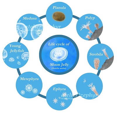 ミズクラゲの生活史を描いたのですが (作品はこちら↓ Behance、foriioにも載せました)、 クラゲは個人的にエフィラ幼生が好きで、 泳ぐ時のぐーぱーぐーぱーしてる感じ(それがとても早い)が 可愛いと思っているのですが、 なにせ大きさが数ミリ。よーく目をこらさないと見えません。 ずいぶん前、水族館でミズクラゲの水槽の前に来た時、 偶然、泳いでいるエフィラ幼生を見つけて感動しまして、 そのまま、しばらく水槽にへばりついて見ていた覚えがあ...