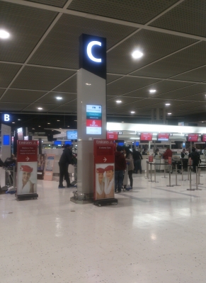 4日の6:10にドバイ到着!! 今回の不安要素その1―――乗り継ぎタイムがやってまいりました!!! 搭乗ゲートが閉まるのは7時半。つまりリミットは約1時間ちょっと...って乗り継ぎ時間少なくない?? 不安を感じながらもとりあえず人の流れに乗って歩いていきます。 しかし、途中で一つ問題が発生。 しばらく歩くとエミレーツのカウンターがありました。 ほとんどの人はそのカウンターに並びますが、そのカウンターを素通りして先を急ぐ人もいます。 ―――さて、あたしはこのカウンターに並ぶべきなんでしょうか、それと...