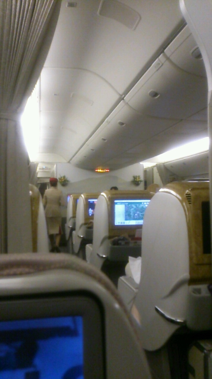 今回お世話になったエミレーツ航空。 「今回はエミレーツで行くよ!!」と話したら、「いいな〜。エミレーツ乗ってみたいんだよね」と羨ましがられたので乗るのをとても楽しみにしていました。 成田空港発ドバイ行の飛行機はボーイング777でエミレーツ最新機体!! そーいえばジャンボジェット機に乗るのって初めてだ。3・4・3の席の配置っていいね。3人席の通路側に座ったんだけど、一つ隣は空いてたから足をあげたりして楽な姿勢で過ごせたのが良かったです。 機内。 前のほうはビジネスクラス。座席が広くて画面が...