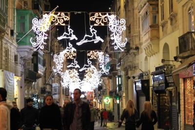 さて、夜のヴァレッタ散策に出かけましょう!! この日は日曜日だったせいもあるのか、日の落ちたヴァレッタの街中はほとんどの店が閉まっており、あまり人もいなくて閑散としていました。あと、こっちではまだクリスマスなのか街中の至る所でイルミネーションがキラキラしてました。 ヴァレッタのメインストリート。ここはまだかろうじて人がいるけど... 横道を覗いてみると人っ子一人いやしねぇ。怪しいにもほどがあるよ!! ちなみにまだ午後6時台。 パレス広場もクリスマス仕様。時々音楽に合わせて噴水...