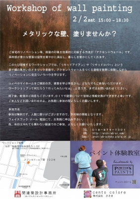 みなさま、あけおめでございます<m(__)m> 2月2日(土)、現在リノベ中のマンションで「アクセントウォールのつくり方ワークショップ」を開催いたします。風合い豊かなメタリック塗装が気軽に体験できます。 DIY好きな方、住まいづくりをご検討中の方にとって、イメージを膨らます事ができる機会となれば幸いです。 「参加無料」&「お食事付」の、太っ腹な感じで開催! 会場キャパの都合上、人数に限りがございます。お申込み、お急ぎの程よろしくお願いし...