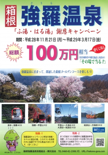 こんにちは。 皆様を笑顔にするため、今日も奮闘いたします! 「ホテル佳山水」でございます。 告知が遅くなってしまいましたが当館は 毎年好評の箱根強羅温泉「ふ湯・はる湯」謝恩キャンペーン (HPはこちら) に参加しております。 以下公式サイトより抜粋↓ 特典1 箱根強羅キャンペーンに参加の旅館・ホテルに宿泊の際に、当キャンペーンのチラシをご持参いただく方に抽選で素敵な景品があたります。(空くじなし)...