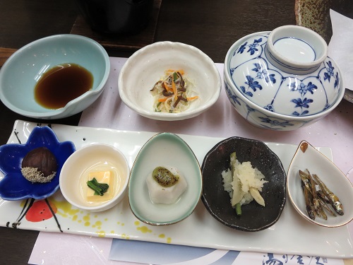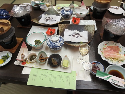 湯守釜屋にて お楽しみの夕飯です。テーブルいっぱいにご馳走が… 御献立表もありました! 前菜 五種盛り合鴨ロース治部煮、もずく酢、厚揚げ田楽、山菜おろし和え、バイ貝旨煮とありますが…(ちょっと違うかな…)※仕入れ仕込みに変わる場合がございます。ですよね〜。厚揚げ田楽がおそらく、枝豆豆腐に、合鴨ロース治部煮がふきの煮物になっていたと思います…。 台の物釜屋オリジナル源泉蒸し豚トロ野菜一式 自家製おろしポン酢 温泉で蒸すという趣向。 こりゃ、旨かった! ポン酢もいいね。 煮物巻き湯波、小茄...