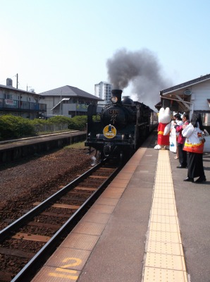 JUGEMテーマ:山口県あれこれ JUGEMテーマ:温泉・ホテル 本日、3月21日より、SL山口号が運行し、湯田温泉駅にて、各旅館の女将さんやスタッフが初便のお見送りを致しました。 今年は、今日から11/1までの、土曜、日曜、祝日の80日間を、C57-1号機、通称「貴婦人」号が津和野までの往復を運行致します。 初日の今日は、天候にも恵まれ、暑いくらいのポカポカ陽気の中、当館、名物女将や、ゆう子ちゃんも、SLの乗客の皆さまに、笑顔で手を振っておりました。