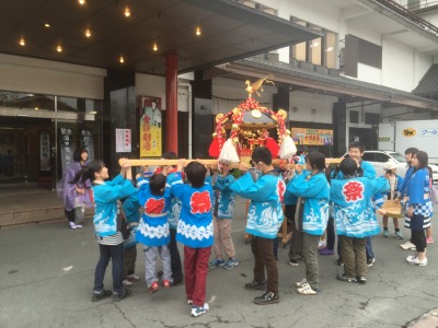 JUGEMテーマ:温泉・ホテル 今年も、恒例の湯田温泉 白狐まつりが、本日4/4(土)、と明日4/5(日)の2日間、開催されます。 なかなかここ近年、天候に恵まれないのが「白狐まつり」ですが、今年は何とか曇り空の下、元気な子供みこしの掛け声と共に、スタート致しました。 ここ最近の暖かさで一気に満開になった桜も、昨日の雨風で、残念ながら若干散ってしまいましたが、文字通り、まつりに華を添えてくれるでしょう。 どうぞ皆さん、今日、明日と、井上公園にいらしてみて下さい。 当館前での子ども神輿の様子