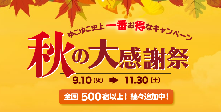 JUGEMテーマ:温泉に行こう ゆこゆこネットは、キャンペーンやクーポンが豊富です。その中でも2019年9月10日(水)〜11月30日(土)までお得なキャンペーンが行われています。 紅葉の時期を楽しめる秋の旅を、ゆこゆこネットではお得に予約できます。通常価格よりも4,000円以上もお得になるプランも用意されているので、秋に温泉旅行を楽しもうと考えている方は見逃したら損ですよ。 全国500宿以上から探せる 全国の500以上の宿泊施設から、お得なキャンペーン...