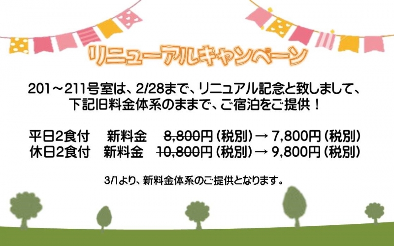 JUGEMテーマ:温泉に行こう 誠に勝手ながら2019年12月01日〜2019年12月20日の間、宿泊棟本館二階客室(201〜211号室)の全室禁煙に向けるリニューアル工事をさせて頂きます。 ご利用のお客様には大変ご不便をお掛け致しますが、ご了承下さいますようお願い申し上げます。 2019年12月20日より、201〜211号室はトイレ付禁煙の新客室として生まれ変わります。 日頃の感謝を込めまして、来年2020年2月28日までリニューアルキャンペーンを開催いたします。 ぜひこの期間中にご来館くださ...